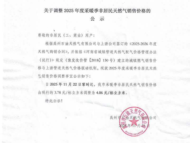 关于调整2025年度采暖季非居民天然气销售价格的公示